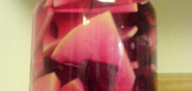 - نسكب الماء المملّح المسكّر البارد على شرائح اللّفت والشمندر بحيث يغمرها بمقدار أربعة سنتيمترات ونضع ملعقة روح الخلّ.